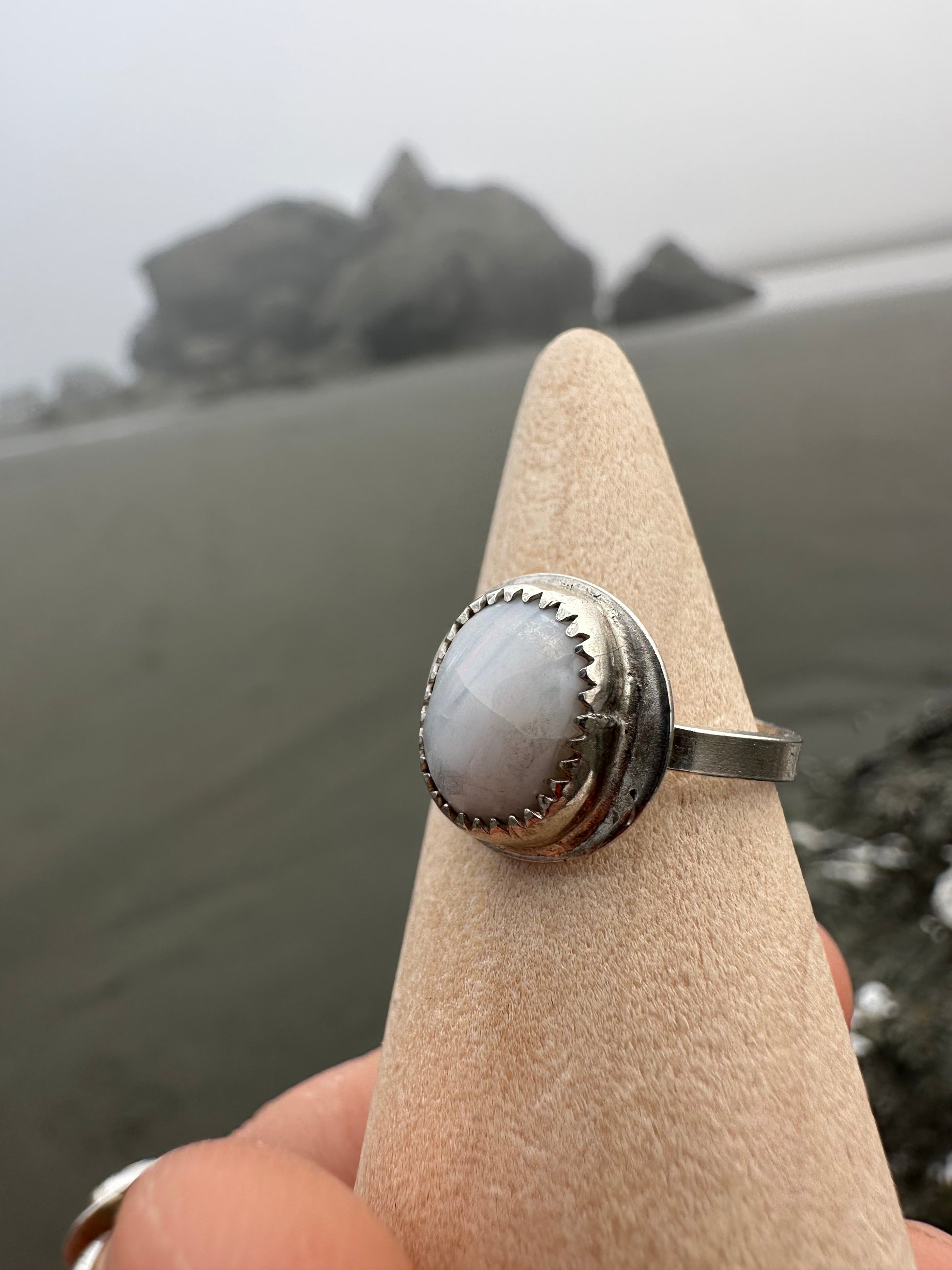 Hand cut and set in sterling silver in my mobile metalsmith studio- a hand-built skoolie that allows me to live and work close to the landscapes where many of these stones are found.