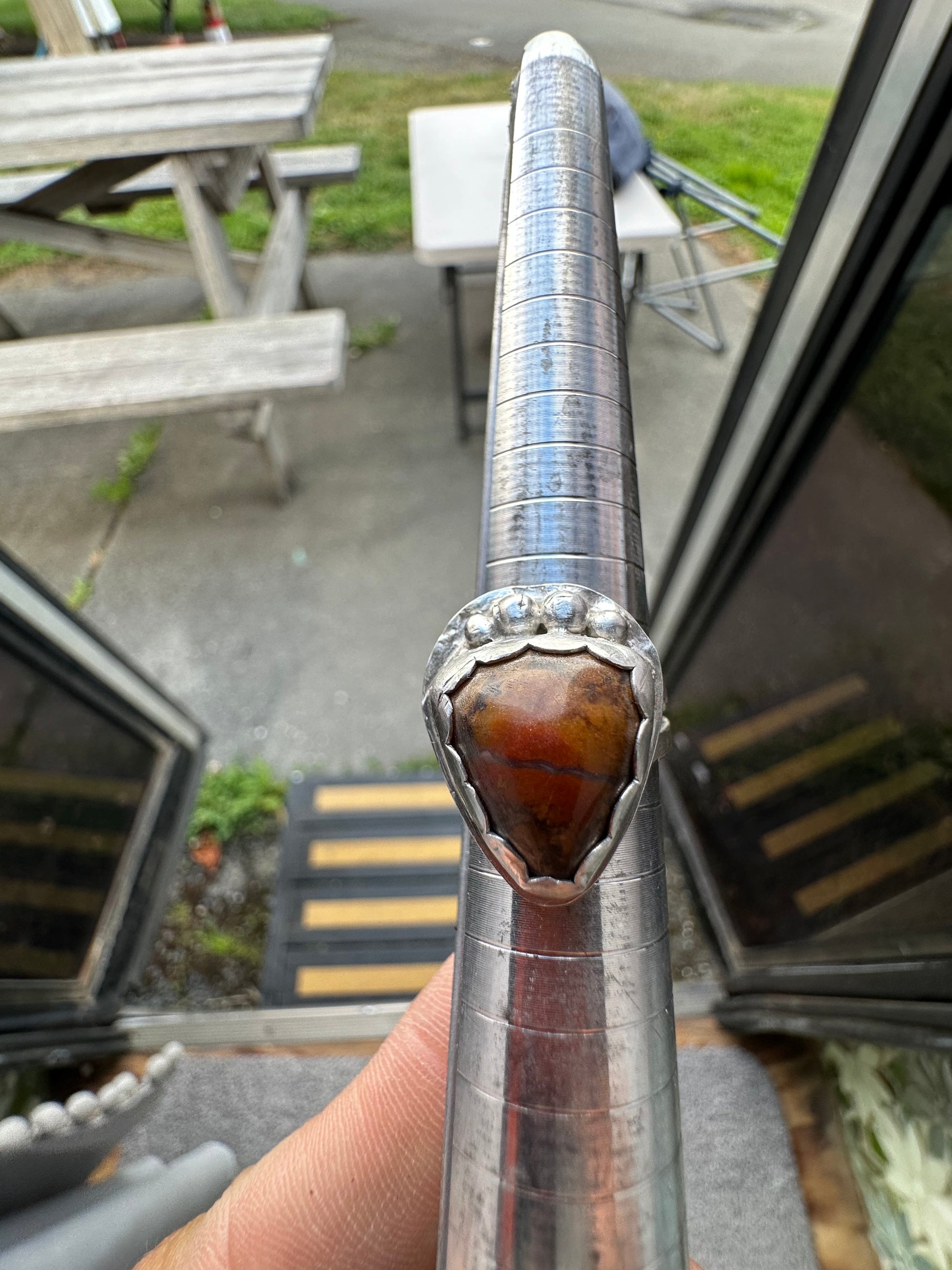 Hand made with a stone from the John Day river in Oregon. Hand picked, cabbed, polished and set. Two stones set so far, I have a few more to finish, this could be sold as a matching set.