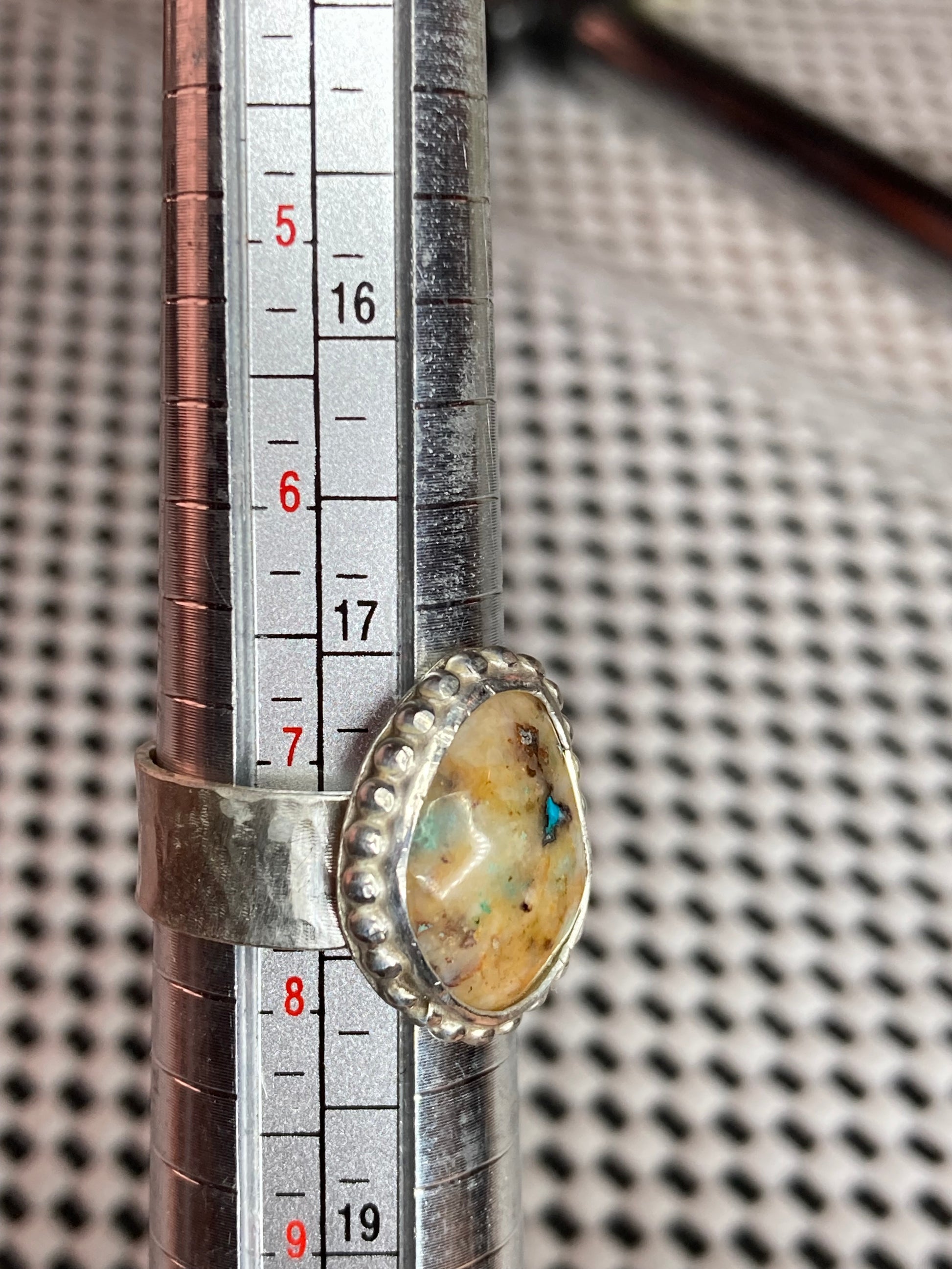 Hand made with a stone from Joshua Tree area of Southern California. Love how this one turned out! Hand mined and cabbed, sale priced to move fast so I can order more supplies and keep practicing silversmithing.