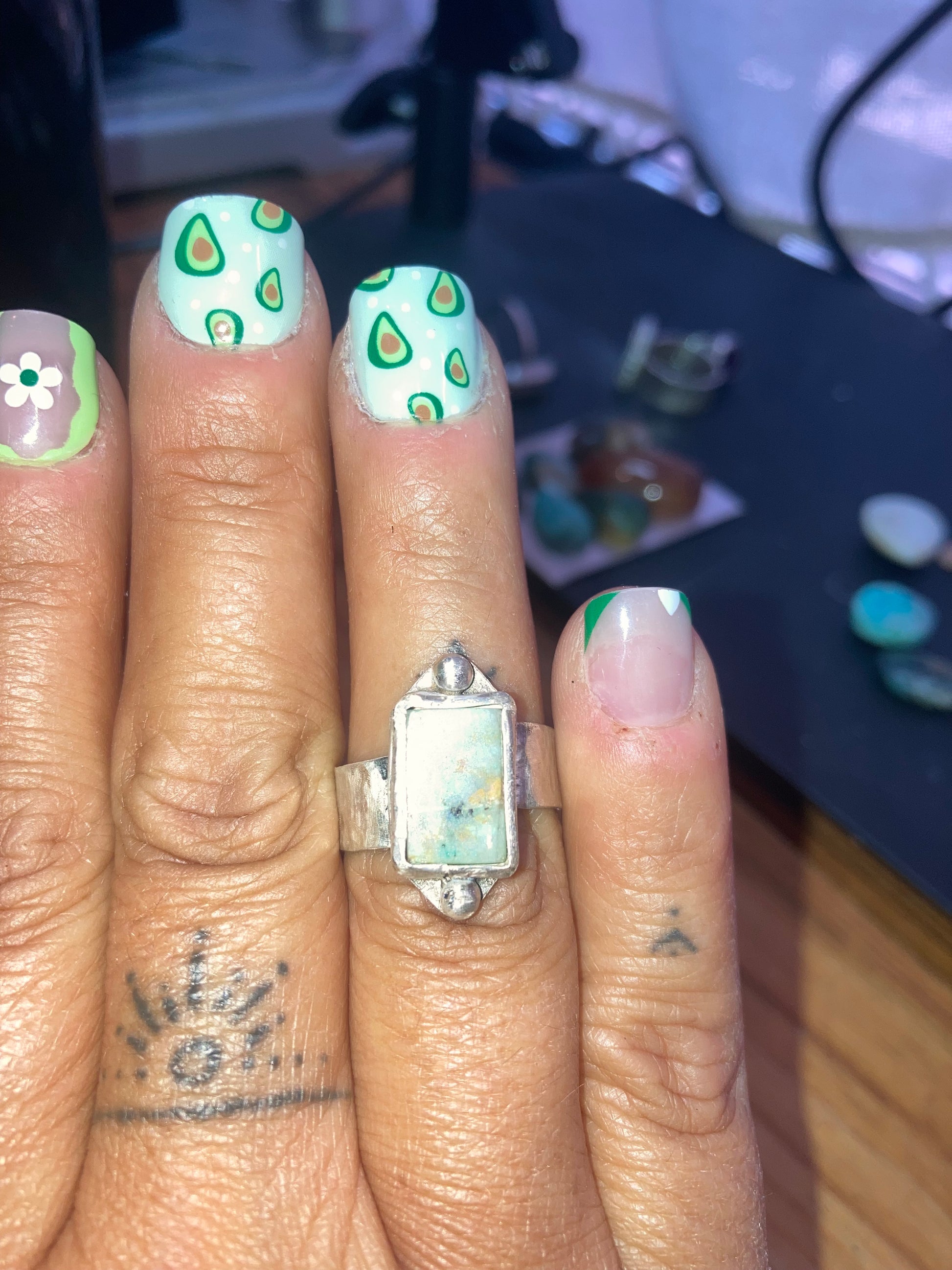 Hand made with a stone from Joshua Tree area of Southern California. Love how this one turned out! Hand mined and cabbed, unique and fun, one of a kind rectangular shape.