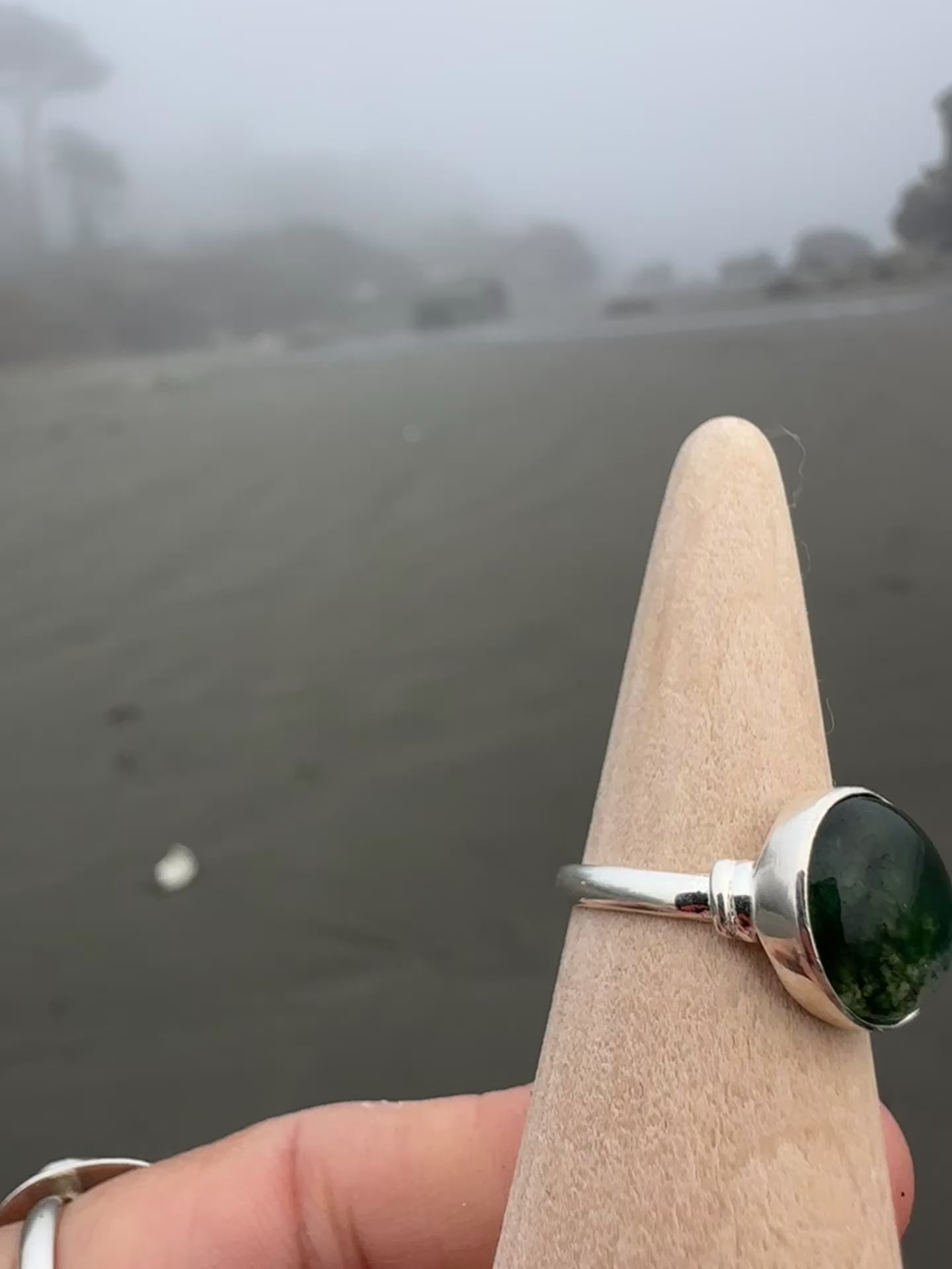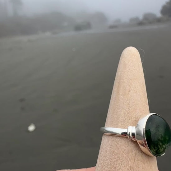 Beautiful 12mm moss agate cabochon set in my mobile metalsmith studio- a self-built skoolie that allows me to live and work close to the landscapes where many of these stones are found.