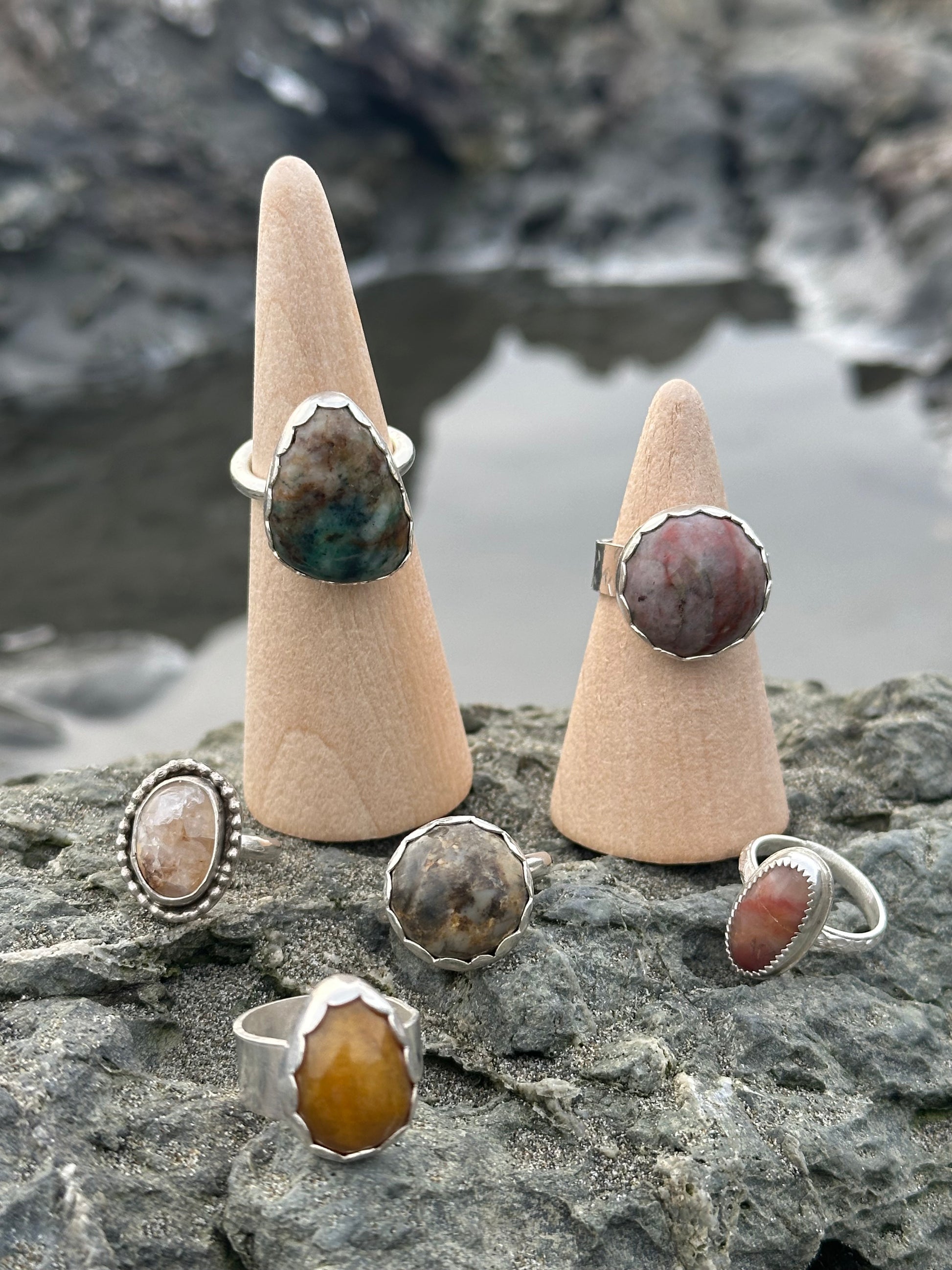 Picked, cabbed, polished and set in my mobile metalsmith studio- a self-built skoolie that allows me to live and work close to the landscapes where many of these stones are found.