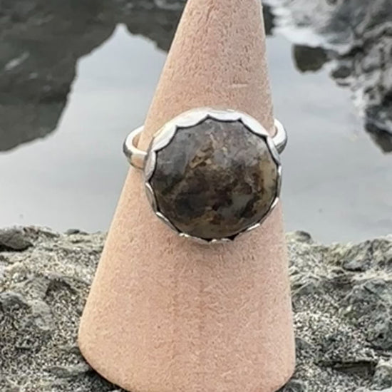 Hand made with lovely NorCal River chalcedony with natural iron and manganese inclusions, size 8.