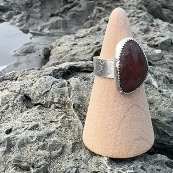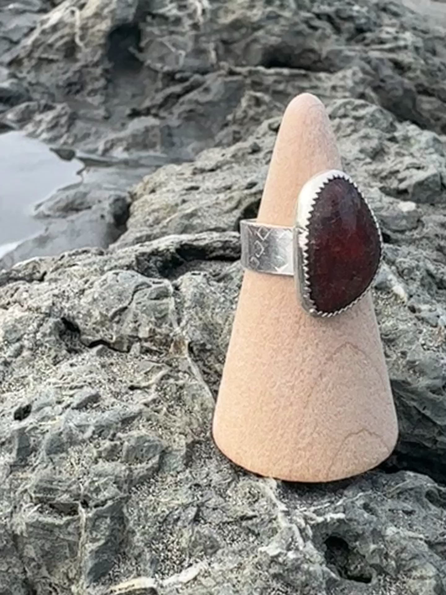Hand cut and set in sterling silver in my mobile metalsmith studio- a hand-built skoolie that allows me to live and work close to the landscapes where many of these stones are found.