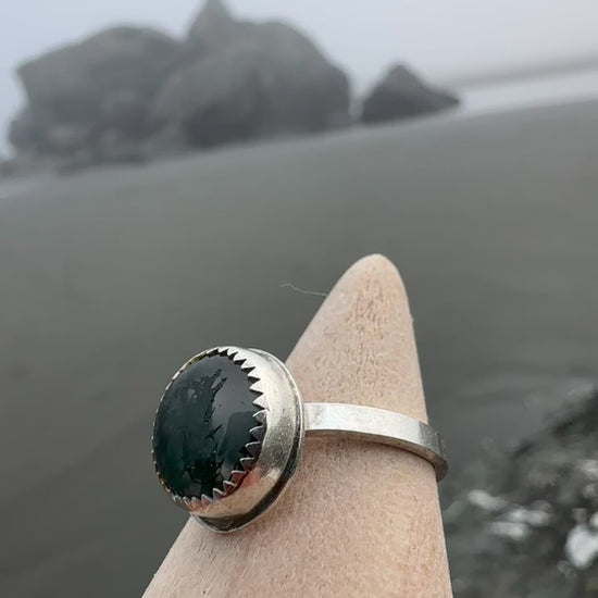 Serrated Bezel Moss Agate Cabochon 10mm, size 7