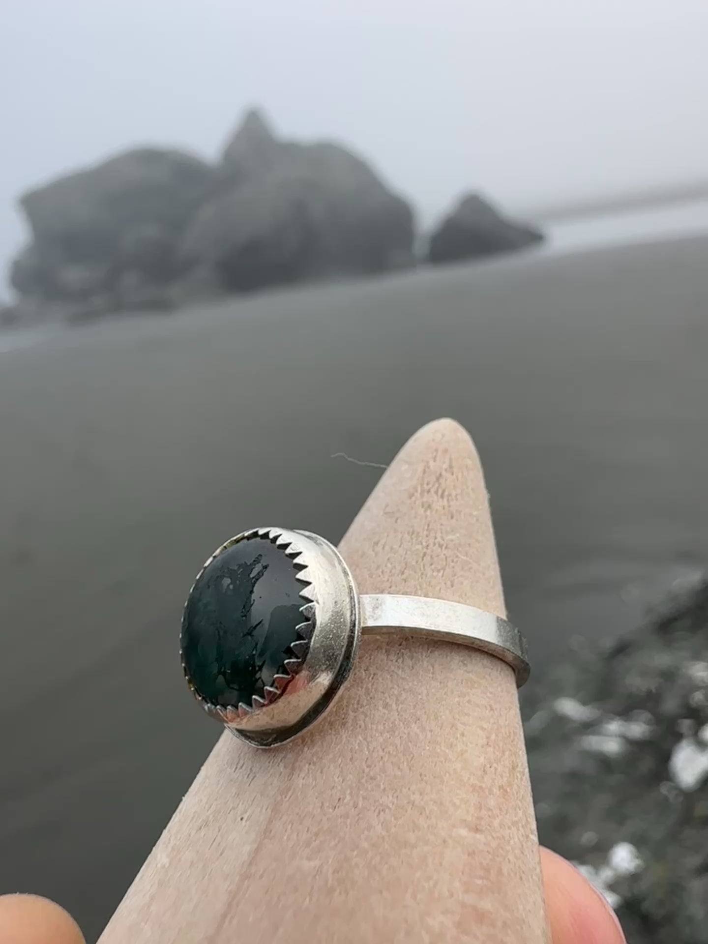 Beautiful 10mm moss agate cabochon set in my mobile metalsmith studio- a self-built skoolie that allows me to live and work close to the landscapes where many of these stones are found.